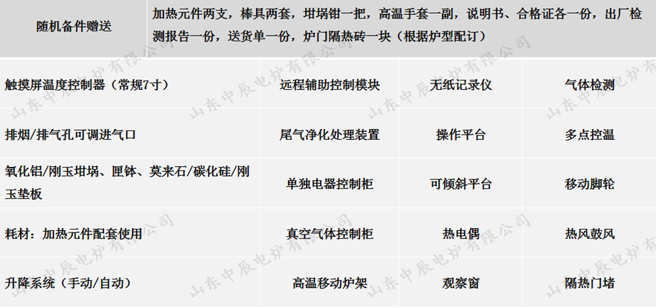 加熱元件兩支,棒具兩套,坩堝鉗一把,高溫手套一副,說明書、合格證各一份,出廠檢測報告一份,送貨單一份,爐門隔熱磚一塊(根據(jù)爐型配訂) |